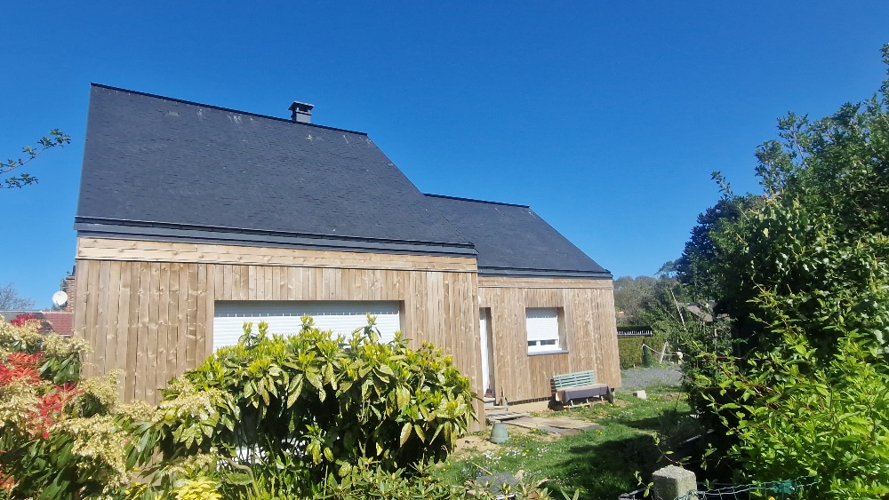 Nous avons réalisé cet agrandissement avec des façade en Zinc noir Anthracithe et des menuiseries Bois /Alu MINCO , la toiture est réalisé en SAPISOL, Un profil en lame de sapin + mousse de Polyuréthane performant et autoporteur, la toiture à ensuite été végétabilisé.